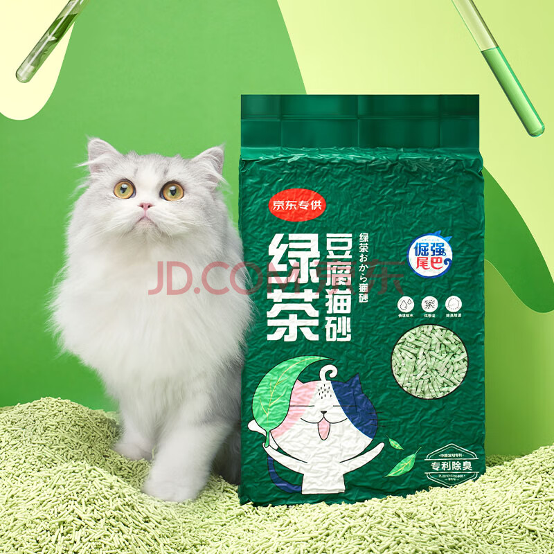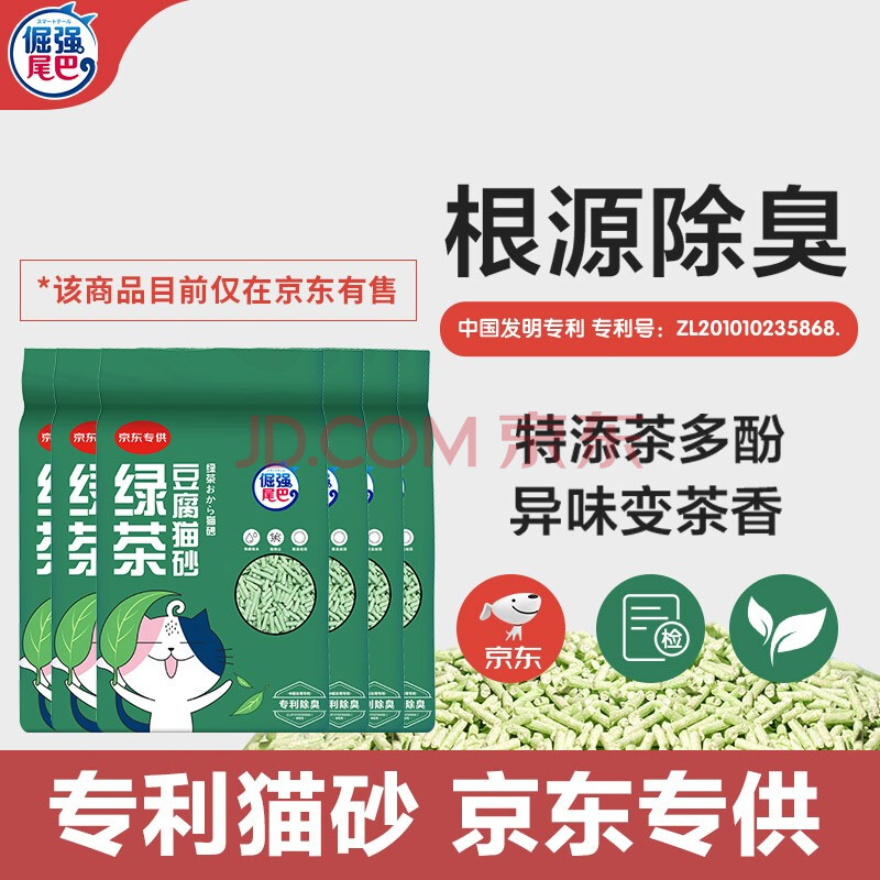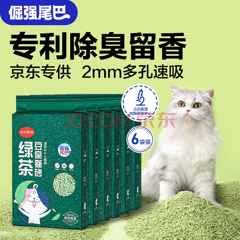 商品相册:倔强尾巴绿茶100%纯豆腐猫砂 专利除臭不粘爪可冲厕所 京东专供4.6斤*6袋第
