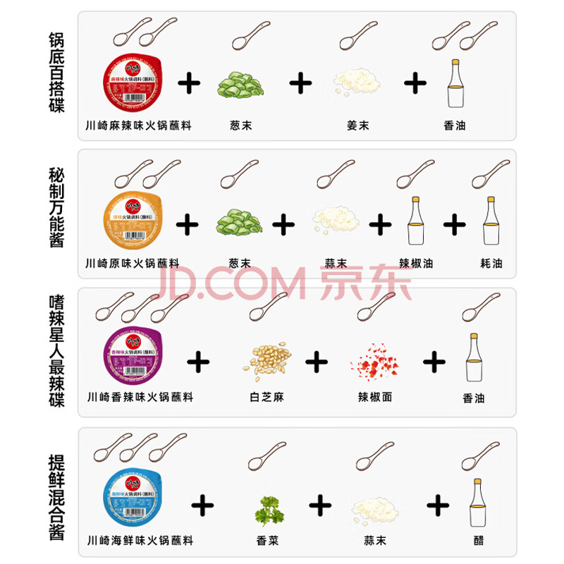 商品相册:川崎火锅蘸料 热销组合100g*4盒(麻辣+海鲜+美味+鲜辣)调味酱料第