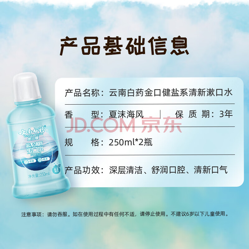 商品相册:云南白药夏沫海风漱口水含盐祛异味洁净口腔清新口气便携旅行套装250ml*2第