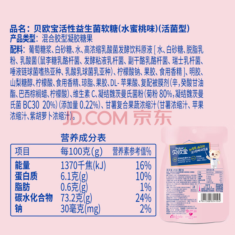 商品相册:贝欧宝活性益生菌软糖 52g 水蜜桃味 休闲零食 儿童零食 糖果第