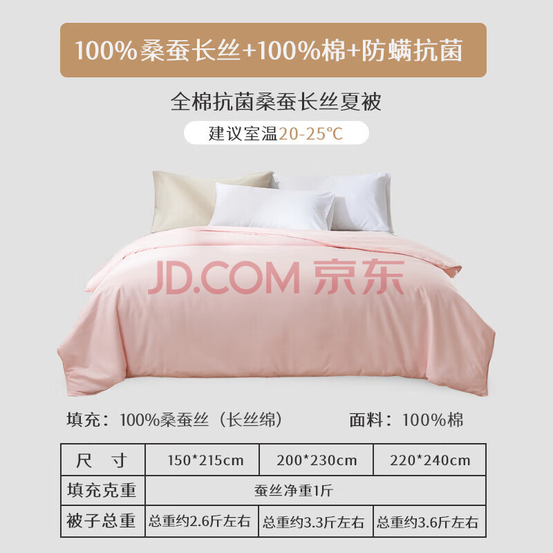 商品相册:太湖雪 100%桑蚕丝空调被 丝重1斤 全棉抑菌胎套 双人被220*240cm粉第