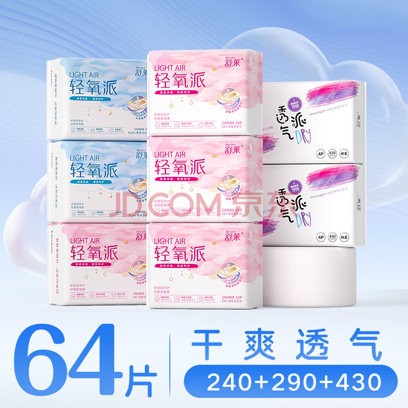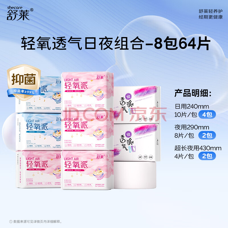 商品相册:舒莱超薄卫生巾轻氧派日夜用组合8包64片透气无感姨妈巾量多瞬吸第