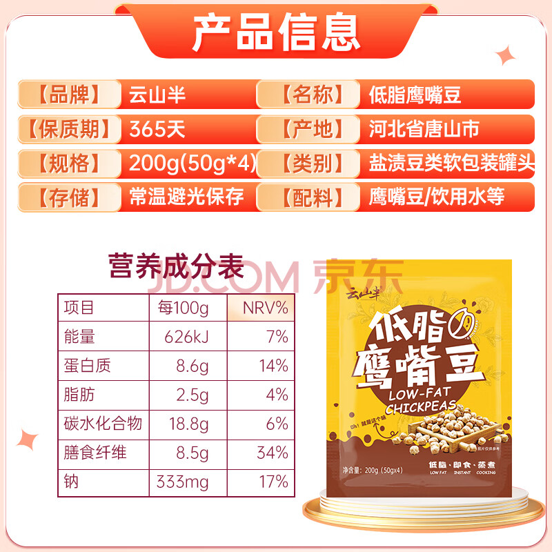 商品相册:云山半低脂鹰嘴豆开袋即食零食饱腹五谷杂粮粗粮熟豆可蒸煮轻食沙拉200g第