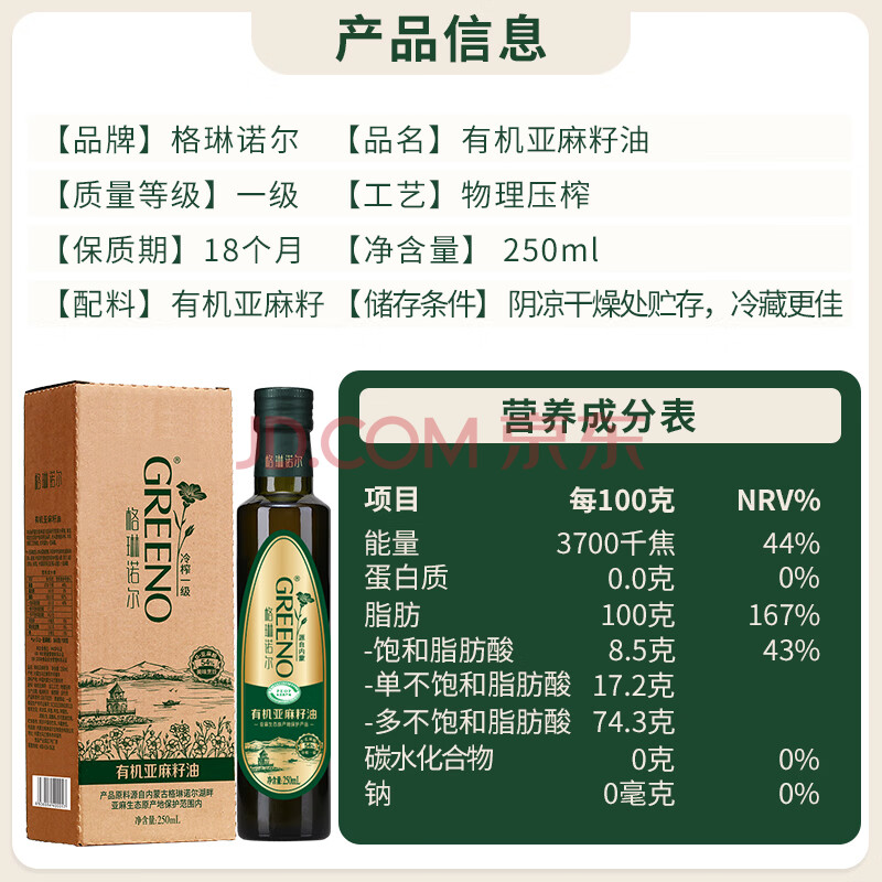 商品相册:格琳诺尔 【保真亚麻籽油】一级冷榨直接喝有机亚麻籽油250ml直饮食用油第