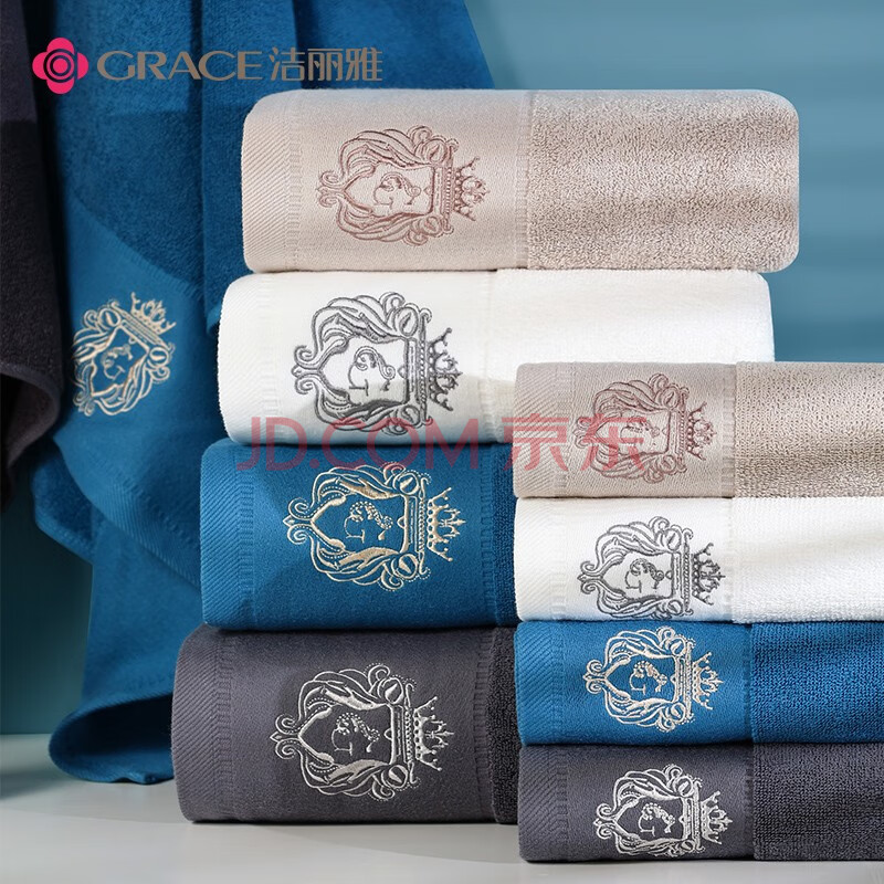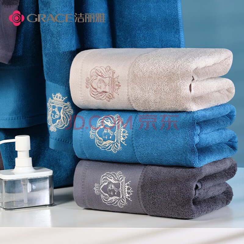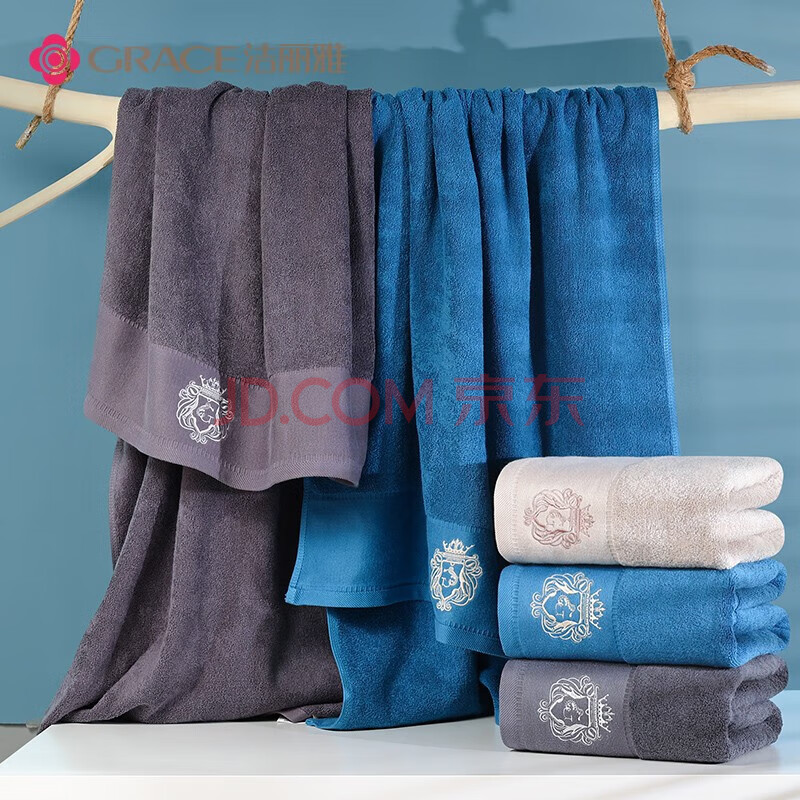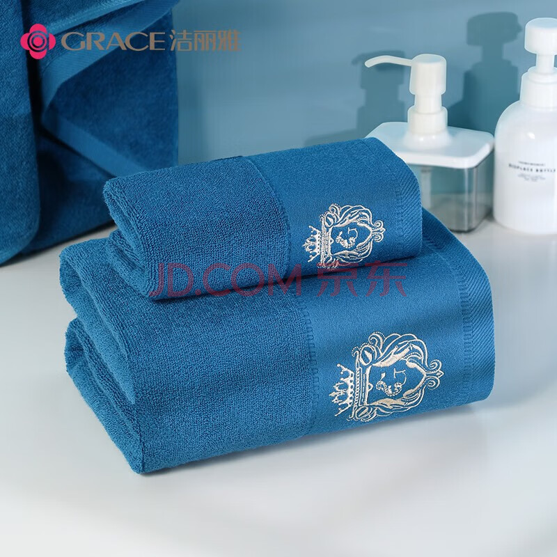 商品相册:洁丽雅(Grace)酒店浴巾家用纯棉1浴巾+1毛巾组合装 柔软吸水全棉刺绣裹巾 深蓝第