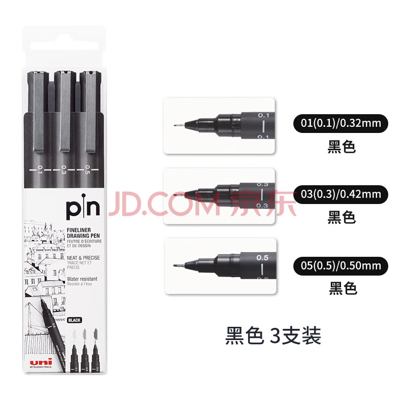 商品相册:uni三菱 水性绘图针管笔 PIN-200美术漫画设计描边描线笔勾线笔 黑色 3支套装第