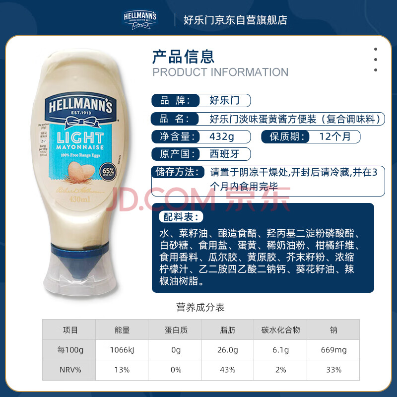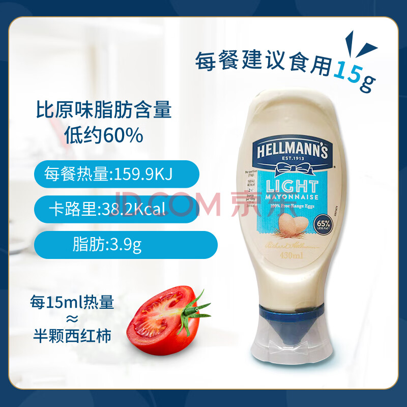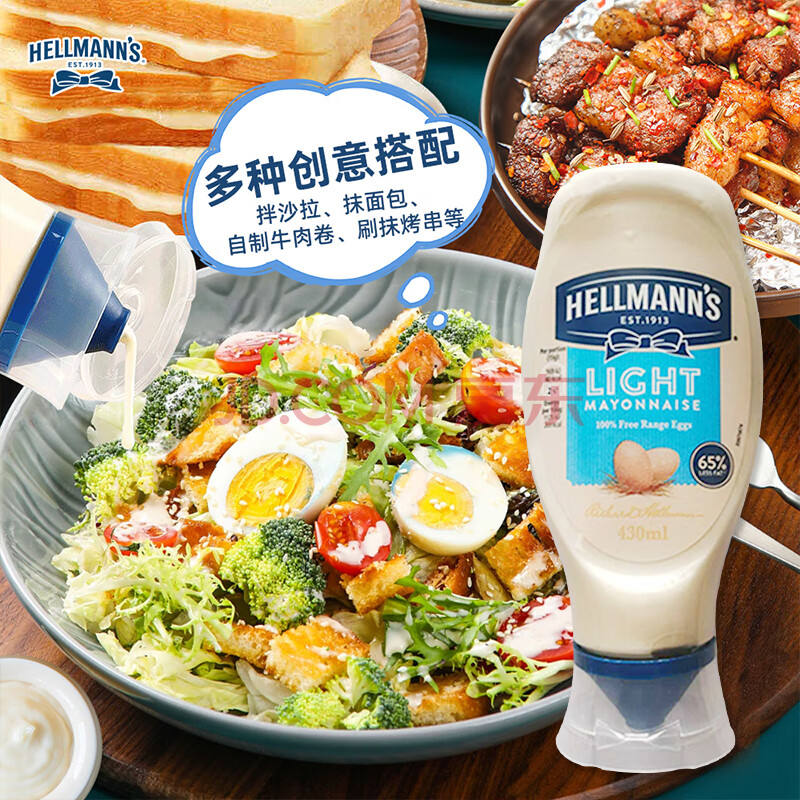 商品相册:好乐门Hellmanns 西班牙进口 淡味蛋黄酱 轻食沙拉酱 432g第