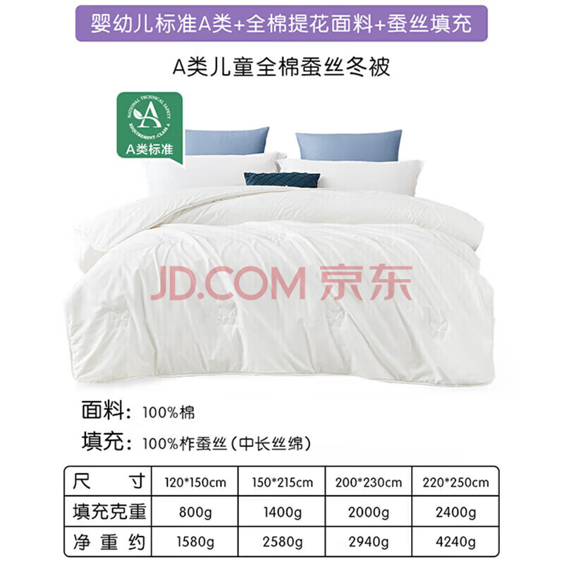 商品相册:罗莱儿童蚕丝被子 母婴A类抗菌100%全棉蚕丝保暖冬被 200*230第