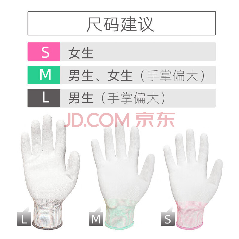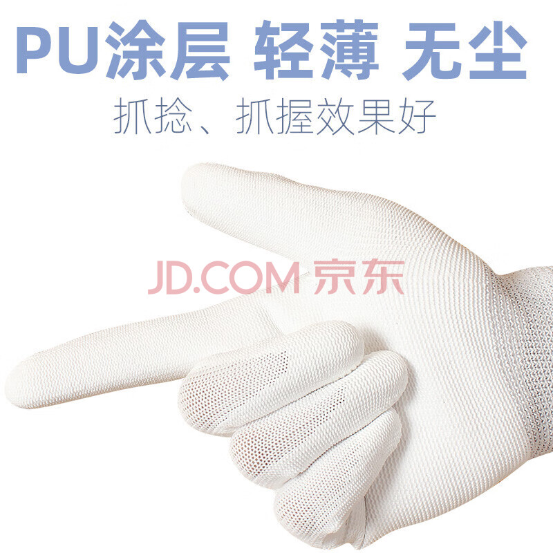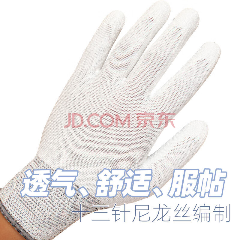 商品相册:典克 涂掌涂指手套劳保耐磨工作pu防静电13十三针尼龙防滑薄款夏季透气白色胶皮男女M码 12双第
