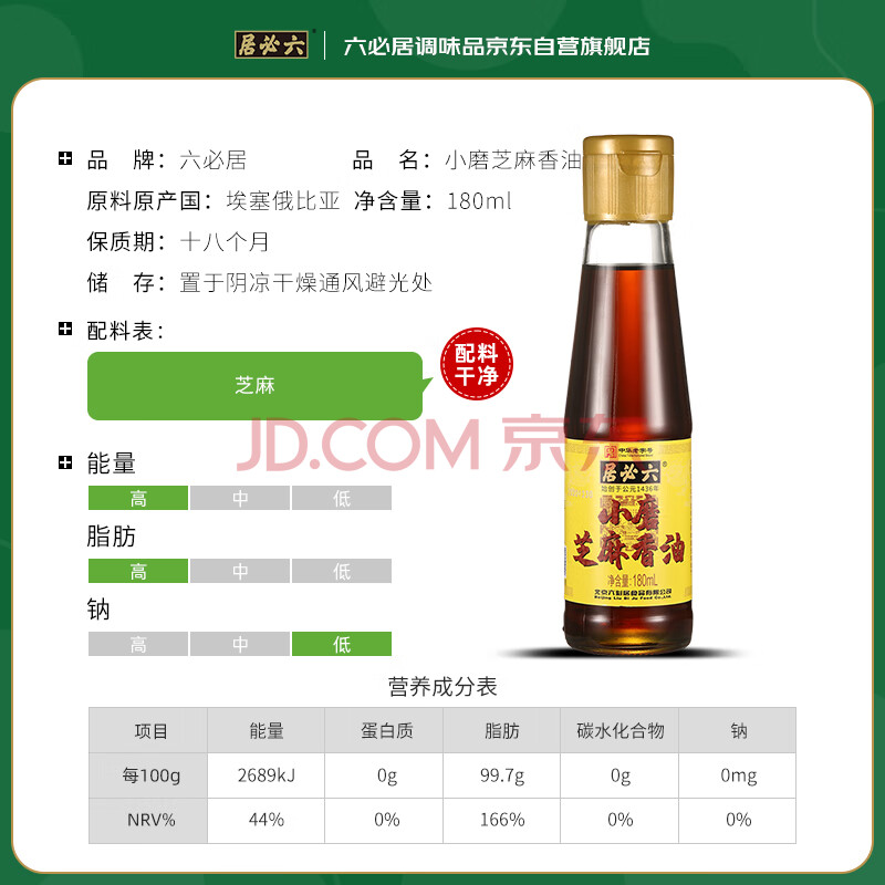 商品相册:六必居 小磨芝麻香油 180ml 传统工艺 水代法 凉拌火锅调味 中华老字号第