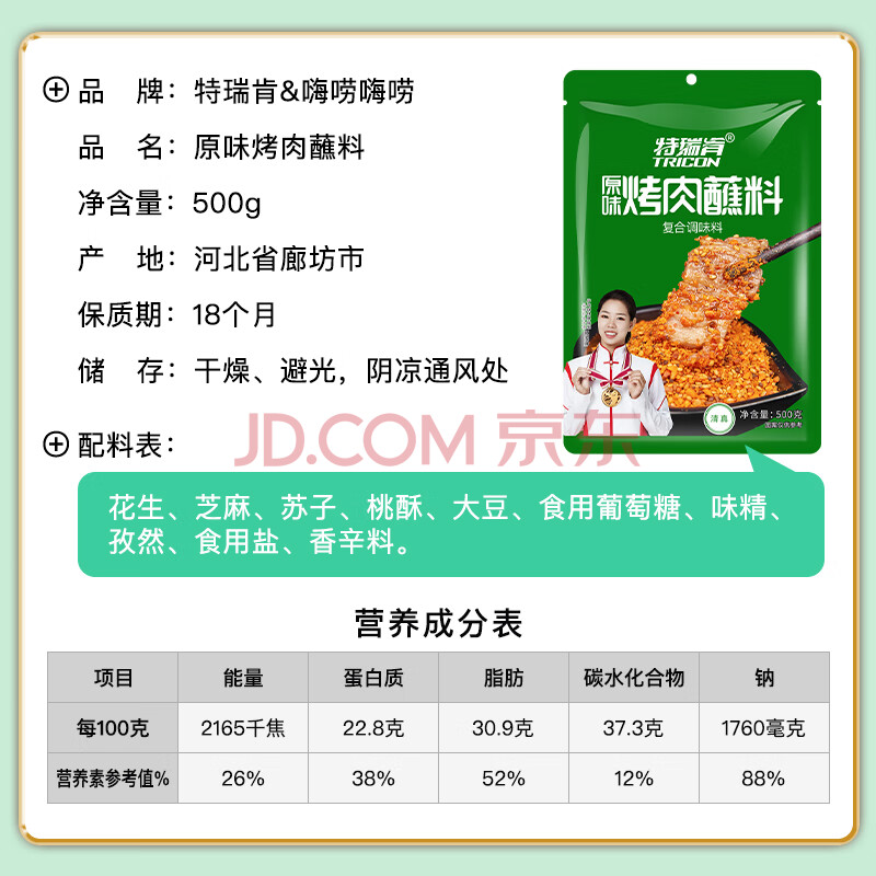 商品相册:特瑞肯(TRICON)烧烤料烤肉蘸料撒料干料碟韩式风味孜然原味零添加香辛调味品500g第