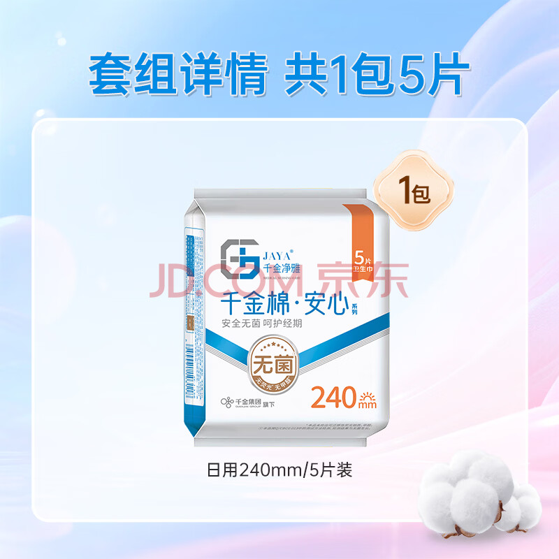 商品相册:千金净雅安心纯棉透气日用卫生巾240mm*5片*1包京东自营姨妈巾消毒级第