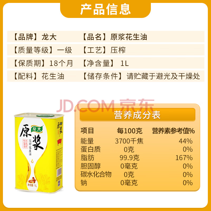 商品相册:龙大【保真花生油】食用油 原浆花生油 1L 头道初榨 地道原香第