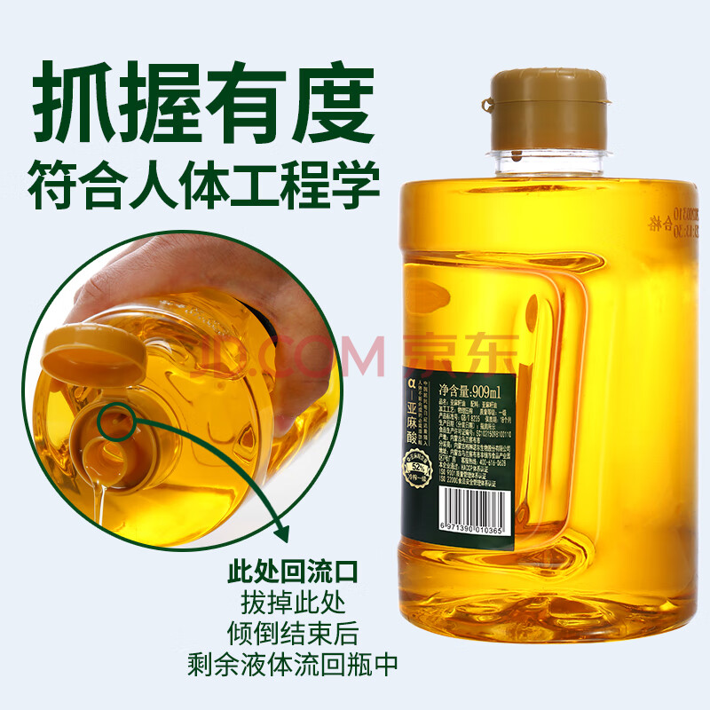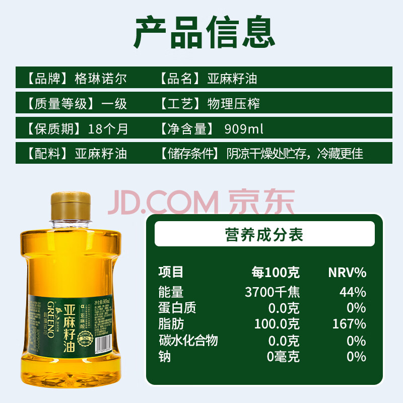 商品相册:格琳诺尔【保真亚麻籽油】一级冷榨食用油909ml可炒菜 补充亚麻酸omega3第