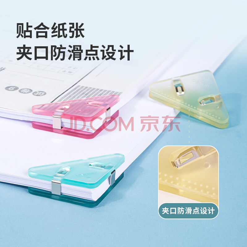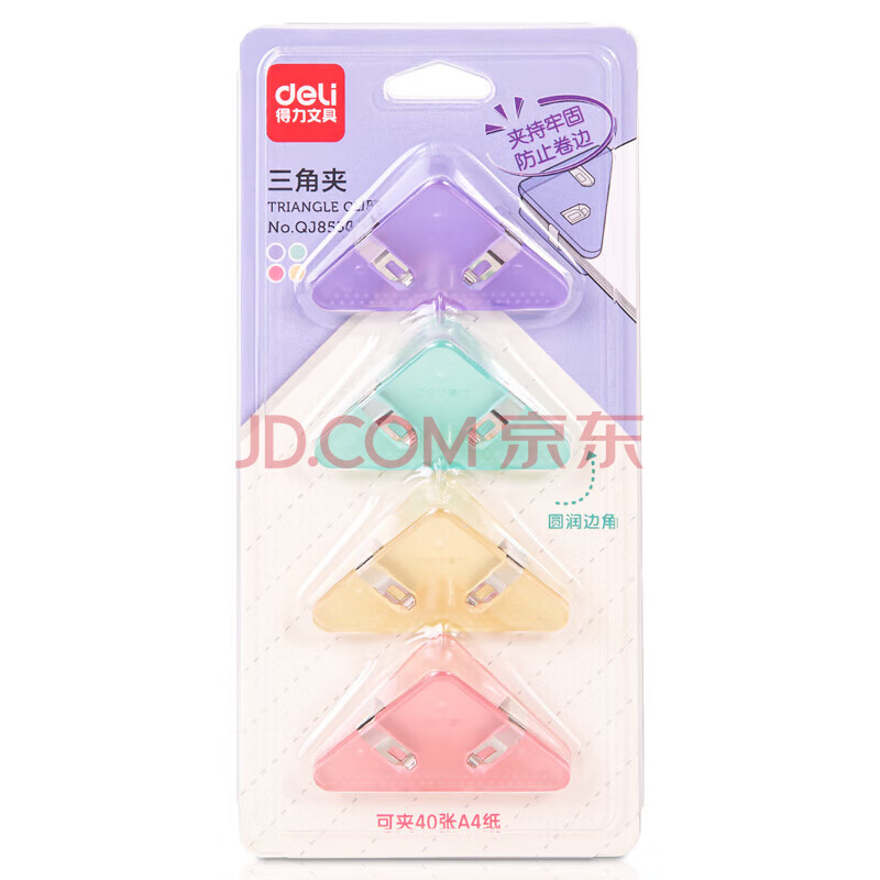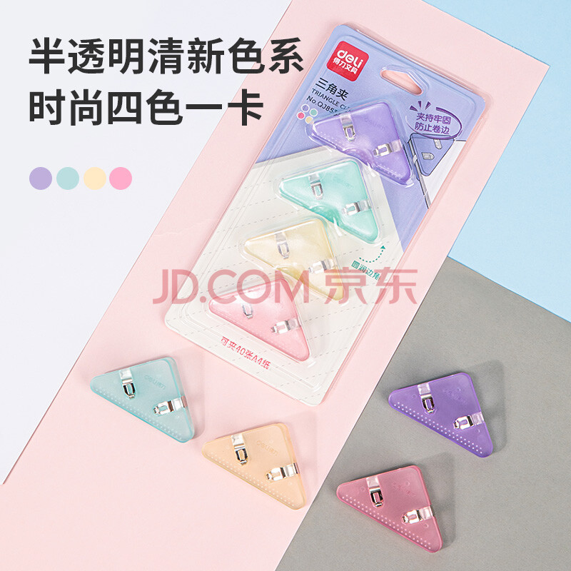 商品相册:得力(deli)4只半透明三角夹 学生资料文件收纳 防翘边防卷边票夹 40页小号边角夹办公用品4只/卡混色QJ8530第