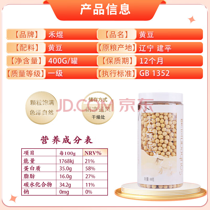 商品相册:禾煜甄选黄豆400g(可发豆芽 打豆浆 大豆 东北 五谷 杂粮 罐装)第