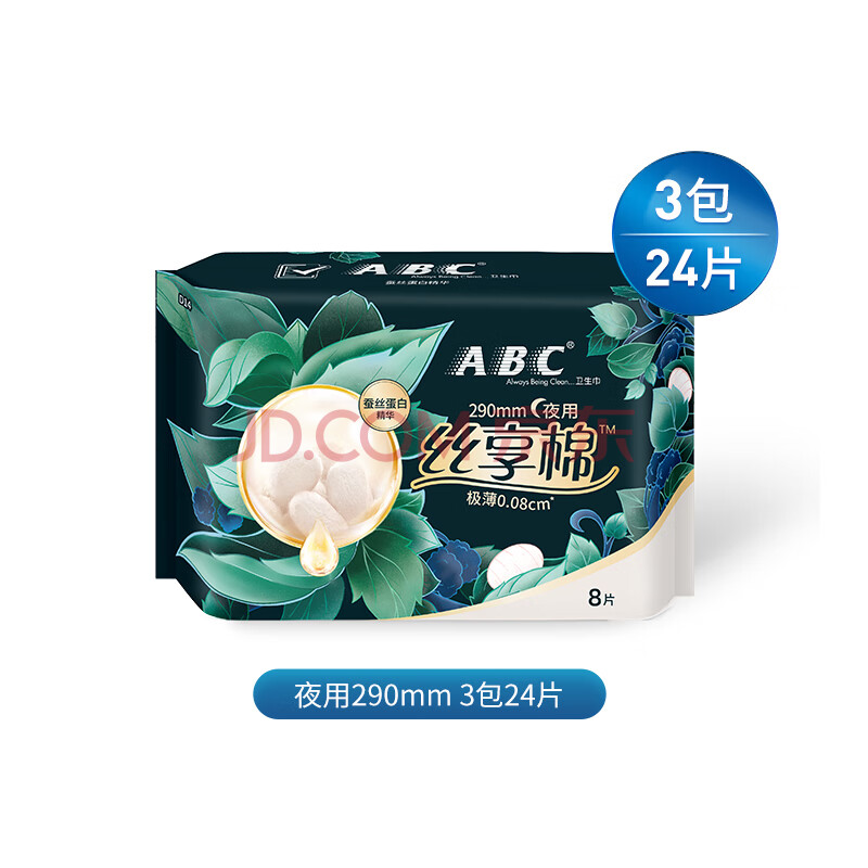 商品相册:ABC丝享棉天然蚕丝蛋白精华夜用卫生巾套装京东自营290mm*24片第