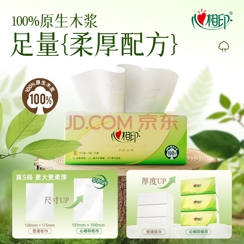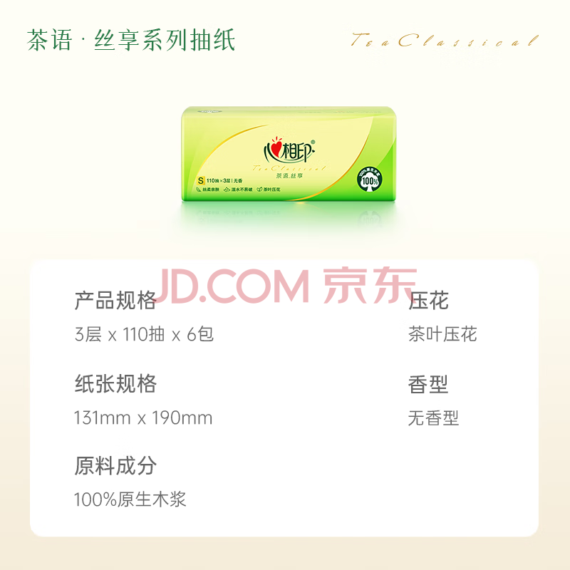 商品相册:心相印抽纸 面巾纸茶语丝享 3层110抽6包 真S码 柔厚亲肤 纸巾提装售卖第