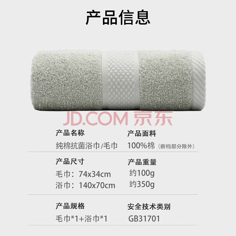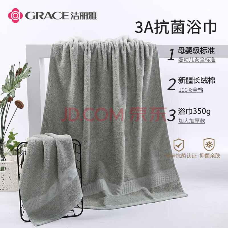商品相册:洁丽雅A类抗菌毛巾浴巾套装 全棉加大加厚款成人男士洗澡巾灰色第