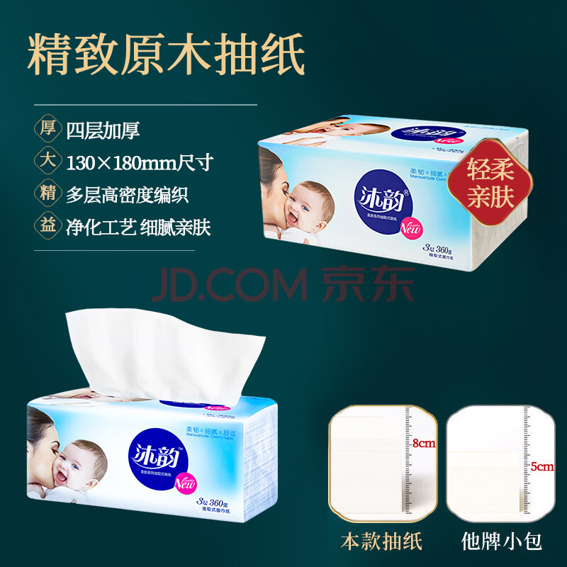 商品相册:沐韵 沐韵 抽纸 纸巾 四层加厚 柔肤抽纸(130*180*4层 360张/包 24包/箱) 第