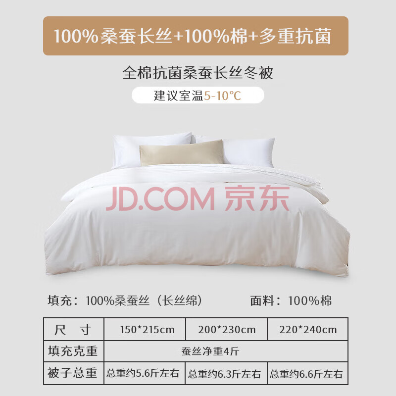 商品相册:太湖雪 100%桑蚕丝厚冬被 蚕丝重4斤 全棉抗菌面料150*215cm白第