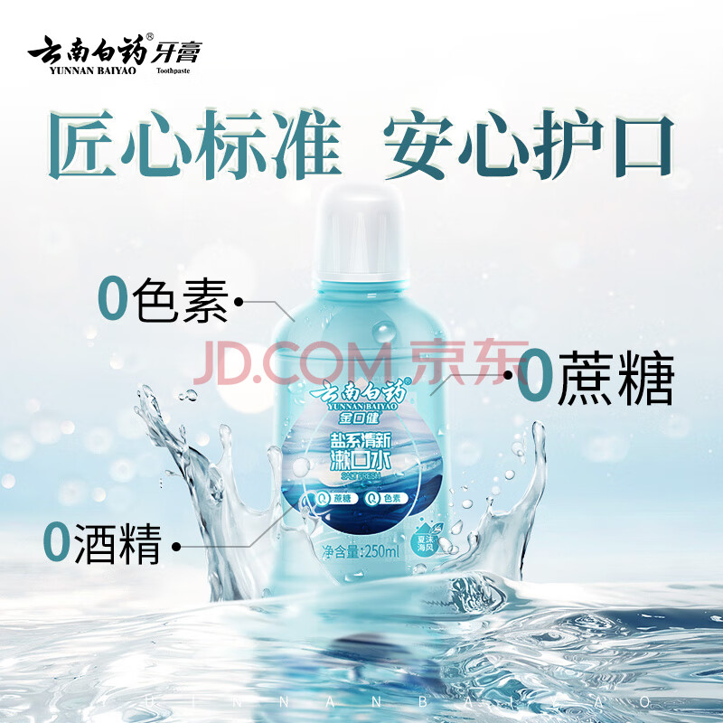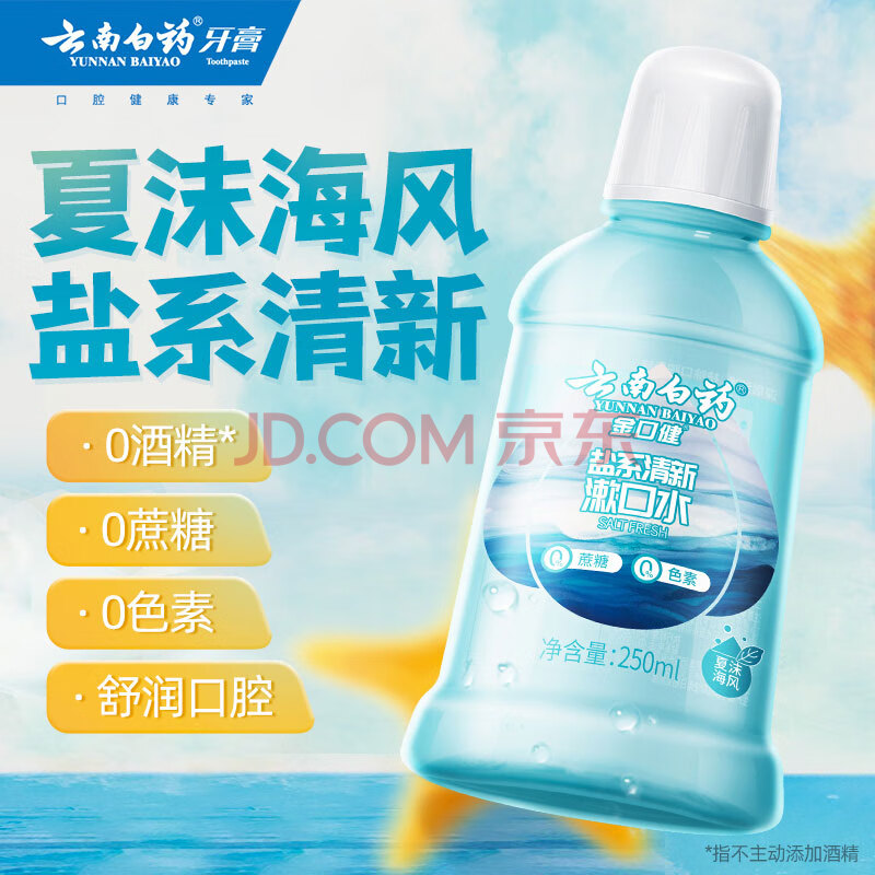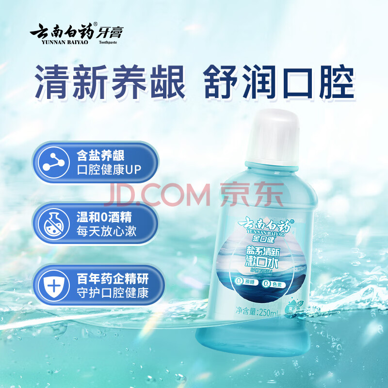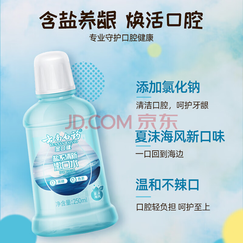 商品相册:云南白药漱口水夏沫海风含盐养龈洁净清新减轻口气0酒精便携套装250ml*3第
