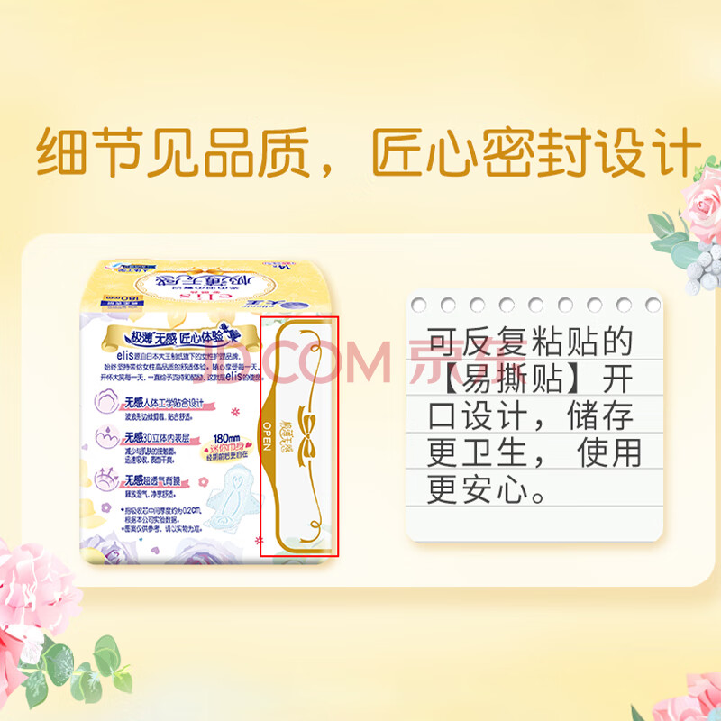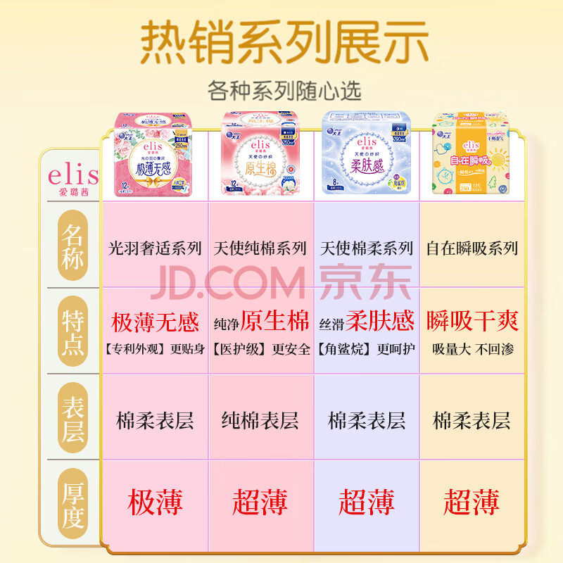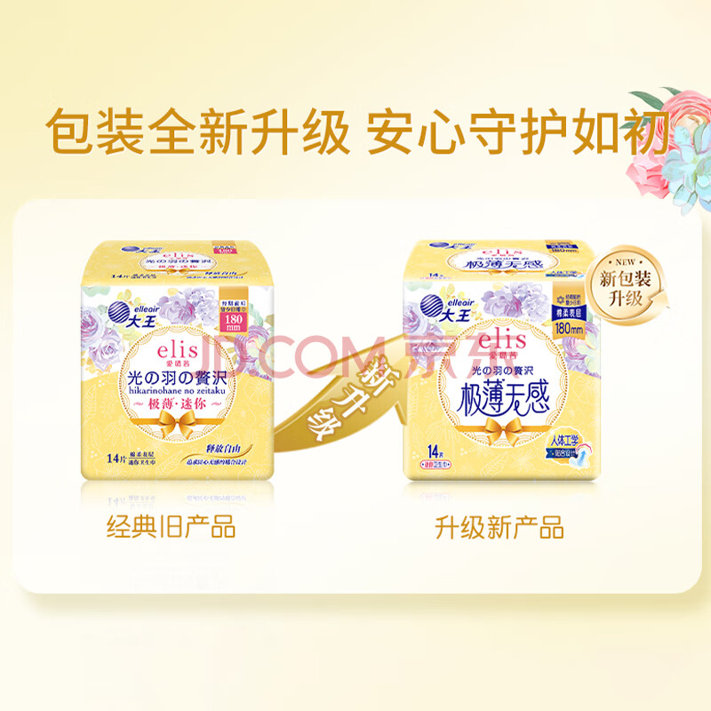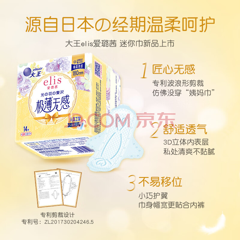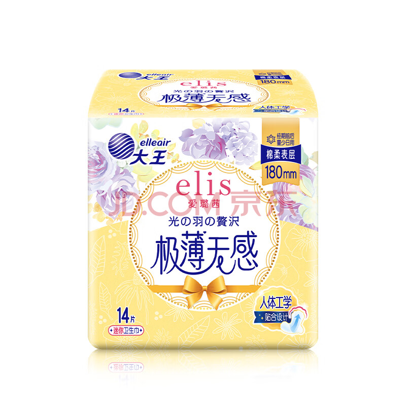 商品相册:爱璐茜(elis)大王迷你卫生巾日用光羽奢适极薄棉柔 180mm 14片瞬吸护垫姨妈巾第