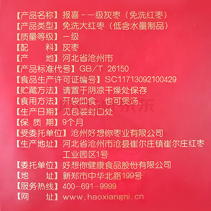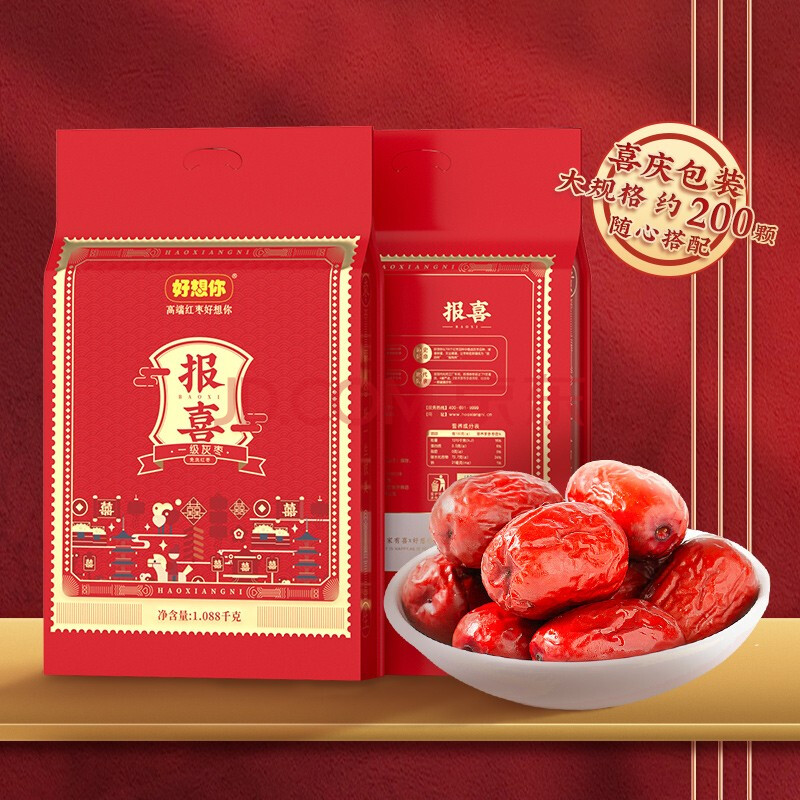 商品相册:好想你 婚庆喜枣报喜1088g/袋 喜糖红枣结婚灰枣约200颗第