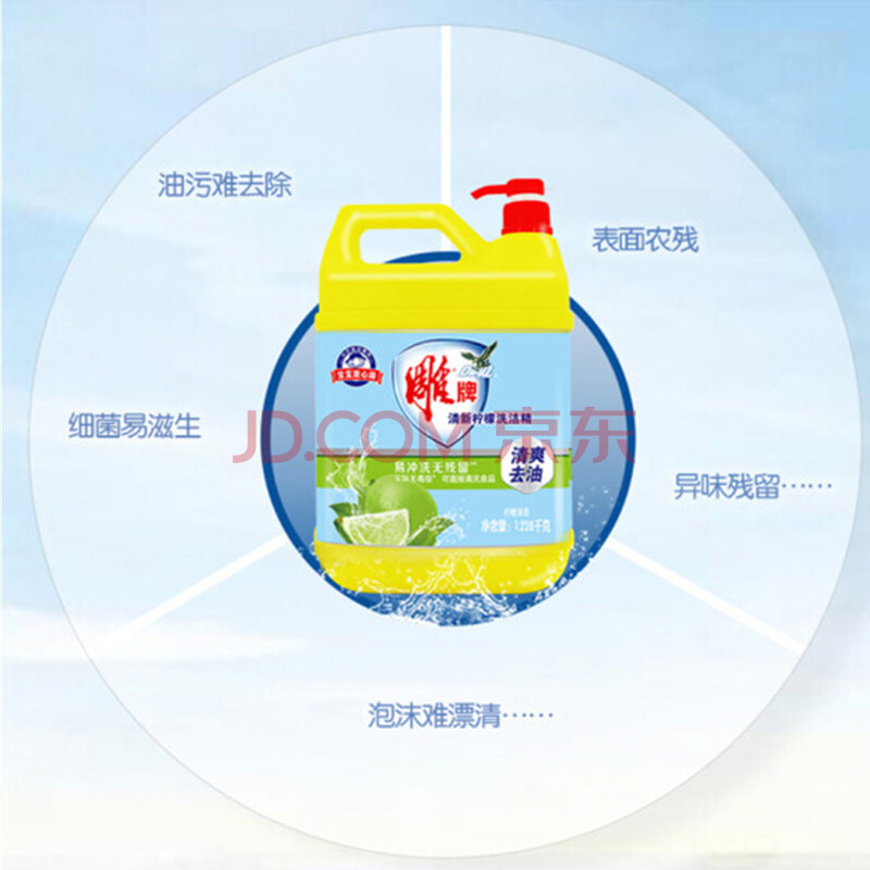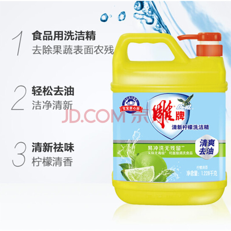 商品相册:雕牌 柠檬洗洁精 桶装去油快果蔬餐具通用 1.228kg*2瓶装第