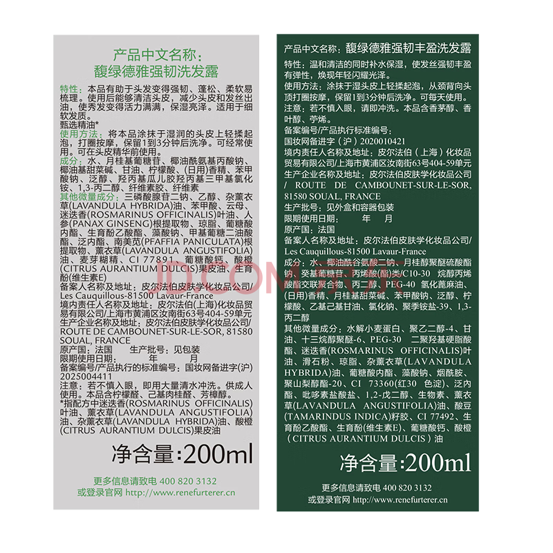 商品相册:馥绿德雅(RENE FURTERER)小粉珠200ml+小白珠洗发水200ml强韧丰盈 水润防断发洗发露 进口第