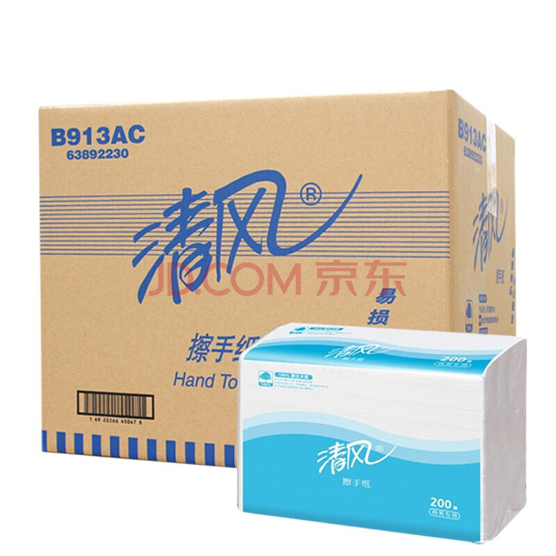 商品相册:清风擦手纸 三折叠式200抽加厚纸巾原生木浆酒店抽纸 整箱20包 B913AC第