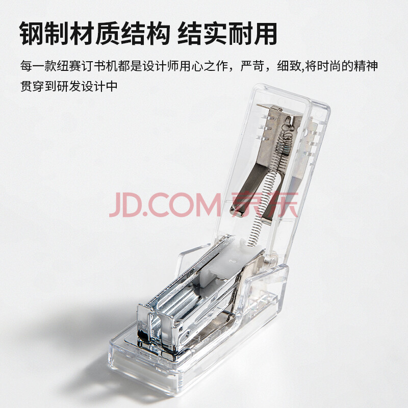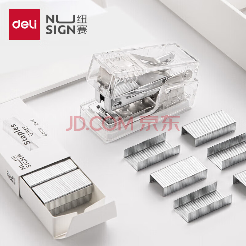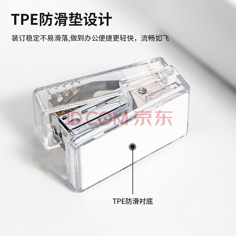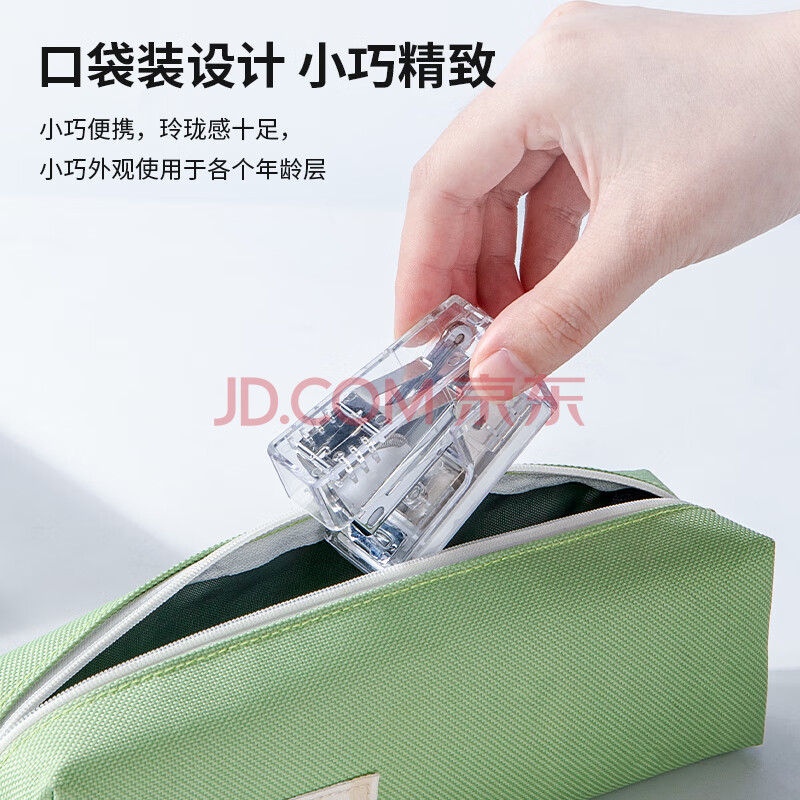 商品相册:得力迷你订书机小号学生专用 办公订书机轻巧便携手握式省力订书装订器小型赠830枚钉 透明NS083F第