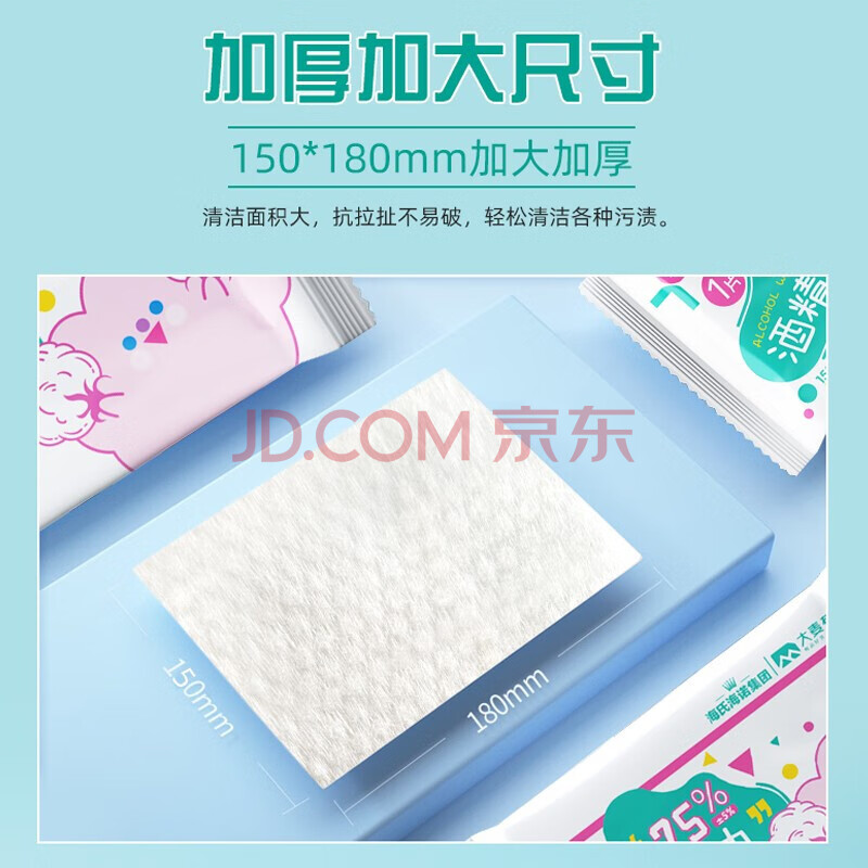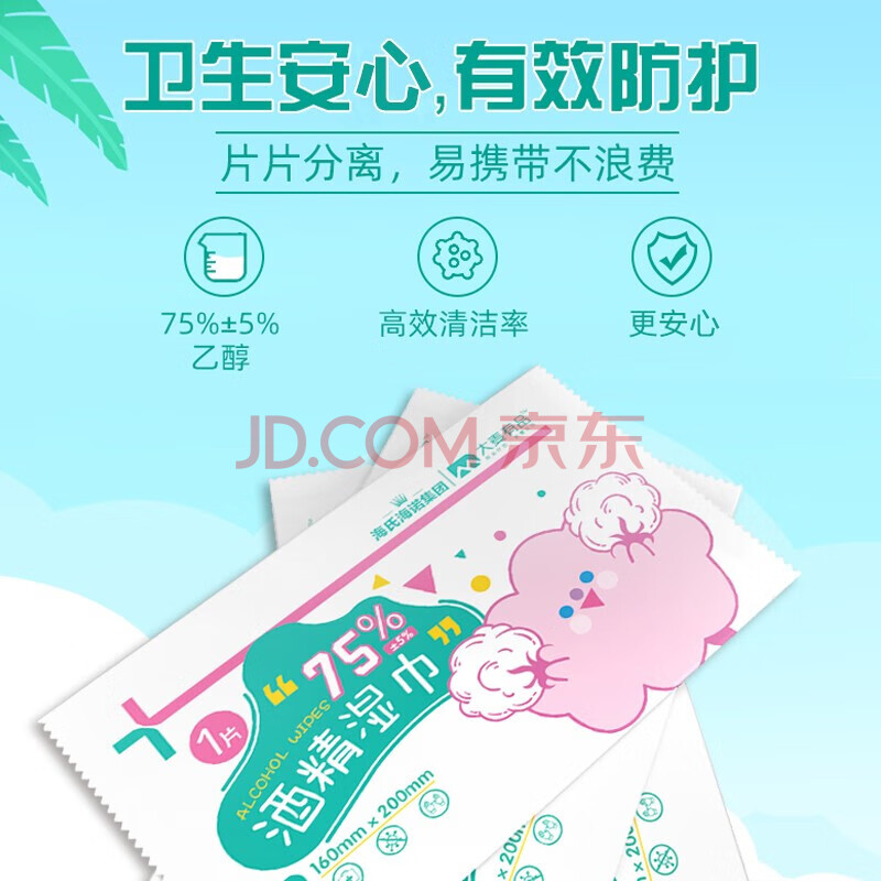 商品相册:海氏海诺乐一享三 75%酒精湿巾 一次性酒精棉片珍珠纹加厚免洗洗手消毒湿巾大号单片独立包装 50片/盒*2第
