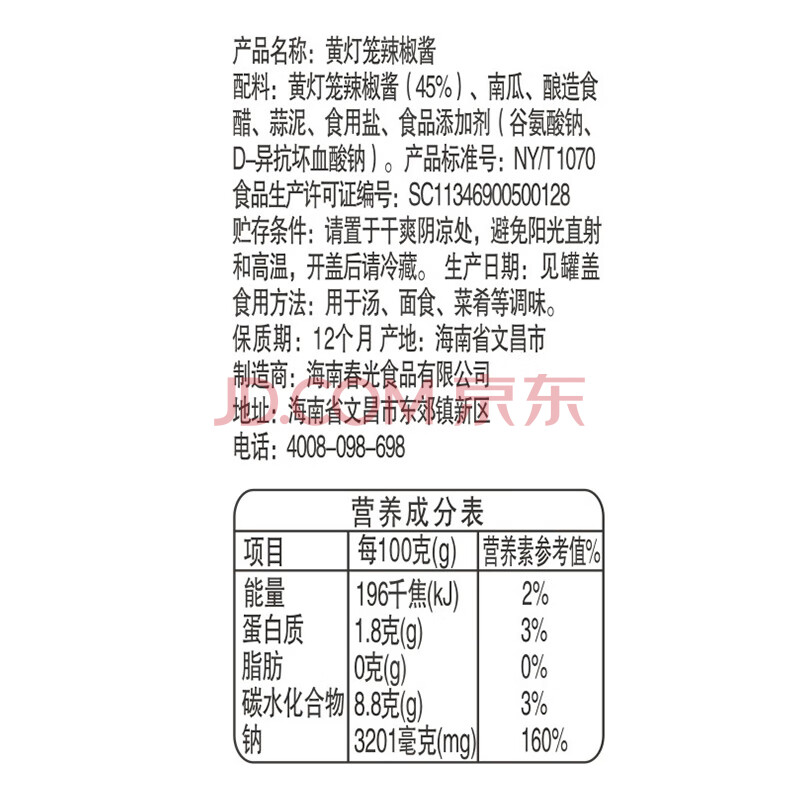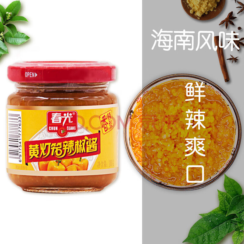 商品相册:春光食品 海南特产 香辣型黄灯笼辣椒酱100g*2 0脂酱酸汤肥牛黄椒酱第