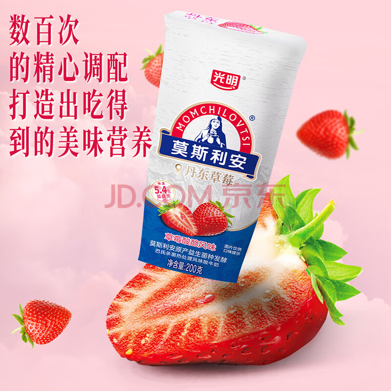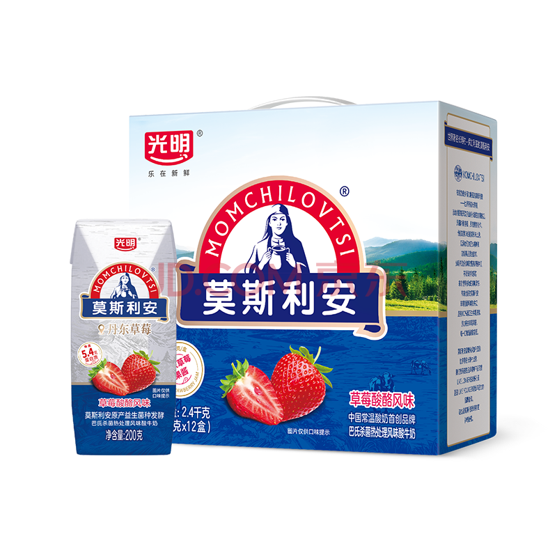 商品相册:光明莫斯利安草莓酸酪风味酸牛奶200g*12盒 早餐下午茶礼盒装第