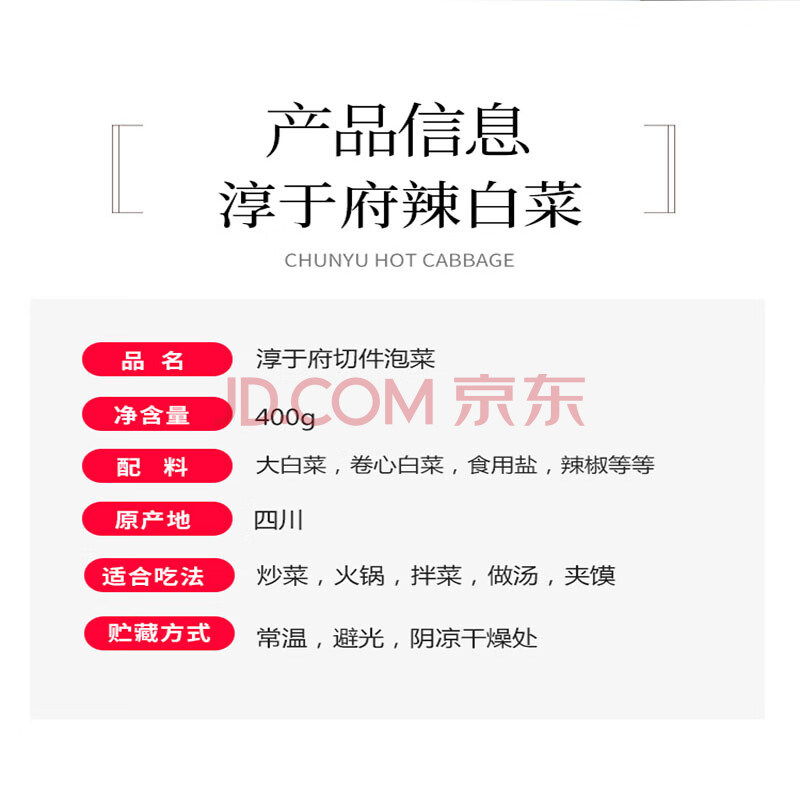 商品相册:淳于府 切件泡菜 400g 韩式风味辣白菜 酸菜下饭拌饭菜酱菜 开袋即食第