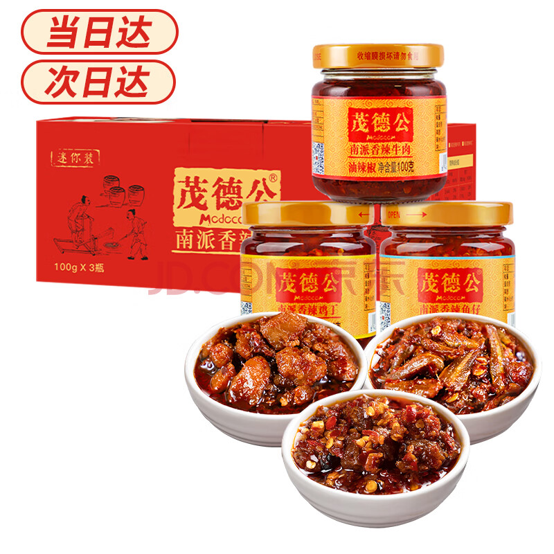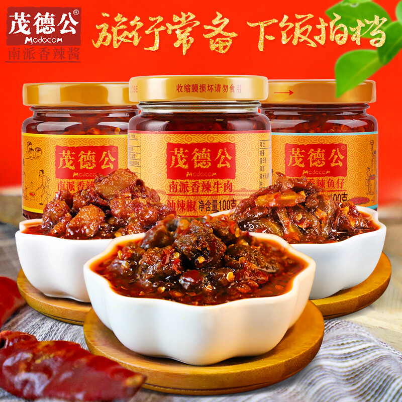 商品相册:茂德公 辣椒酱香辣牛肉酱鱼仔酱鸡丁香辣酱下饭酱100g*3瓶旅行礼盒装第