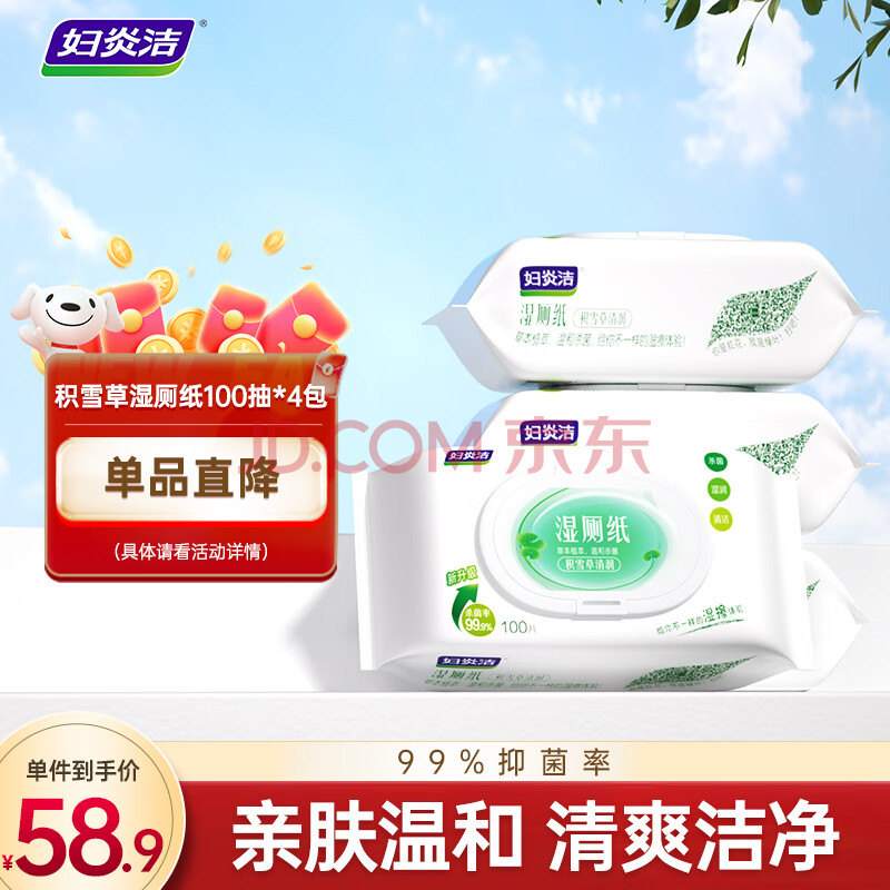 商品相册:妇炎洁湿厕纸积雪草100抽*4家庭装私处湿纸巾擦屁股抑菌男女通用第