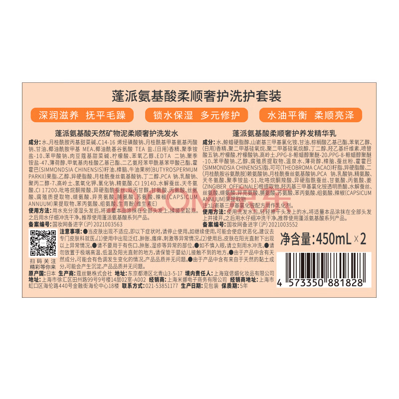 商品相册:蓬派(CLAYNAL)受损干枯改善洗发水护发素套装礼盒450ml+450ml第