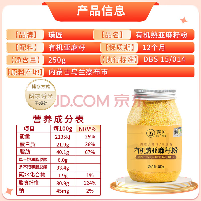 商品相册:璞匠 有机亚麻籽粉 内蒙古金色亚麻籽低温烘焙250g第