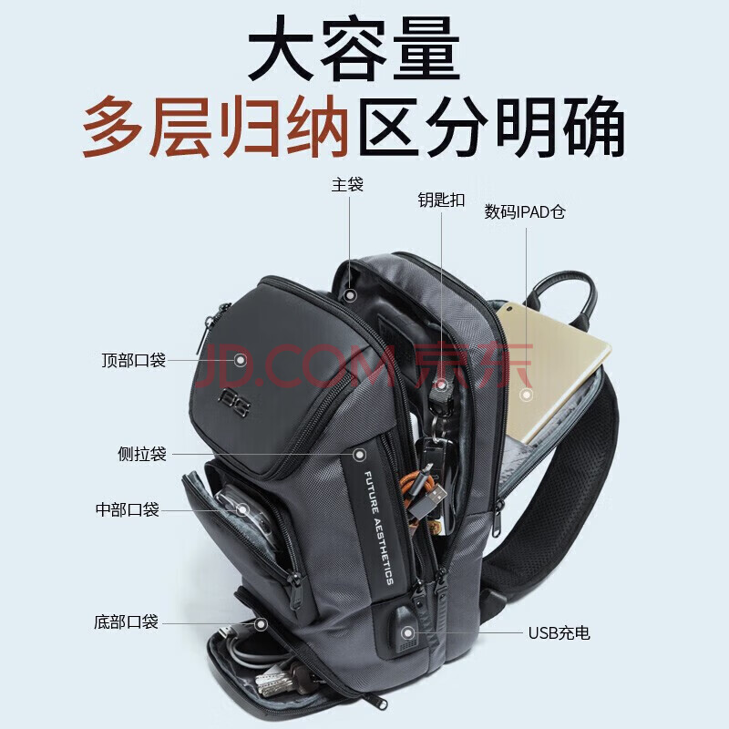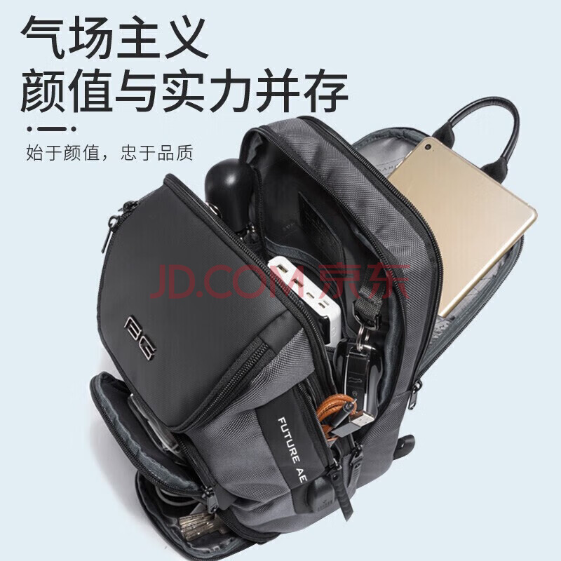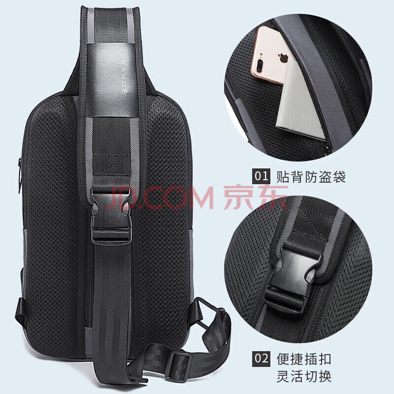 商品相册:班歌胸包男士斜挎包时尚单肩包多功能防泼水小背包大容量iPad包7086灰第