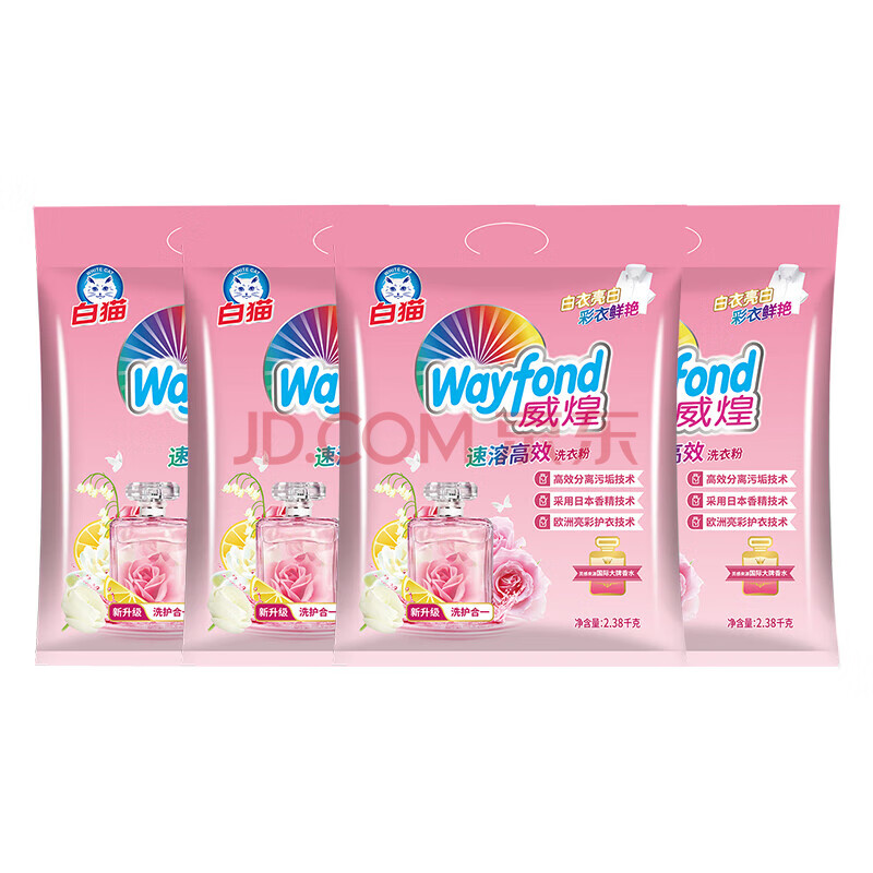 商品相册:白猫 威煌速溶高效洗衣粉4.76斤*4袋(整袋装) 含高效去油因子第
