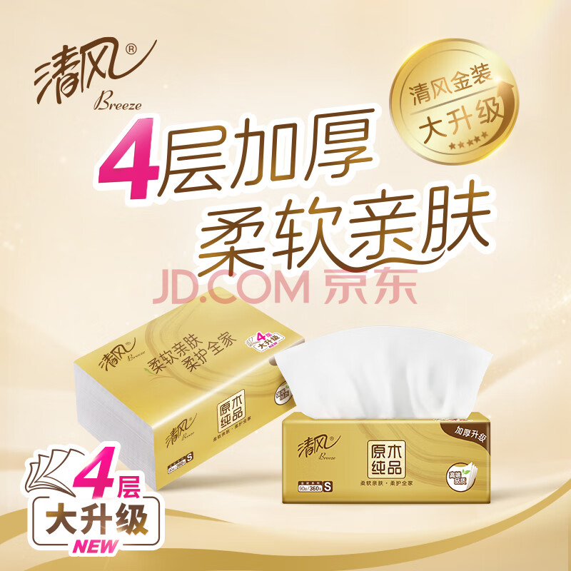 商品相册:清风抽纸4层*90抽24包实惠装原木纯品无香餐巾纸卫生纸 包装随机第