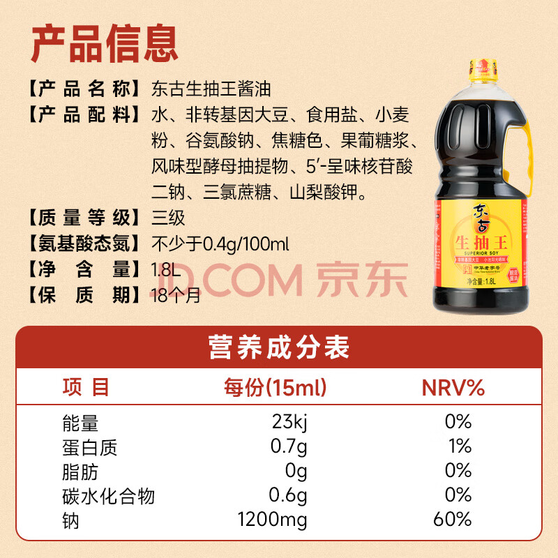 商品相册:东古 生抽王【酿造酱油】1.8L 红烧炒菜凉拌鲜味足 中华老字号第
