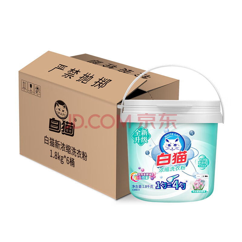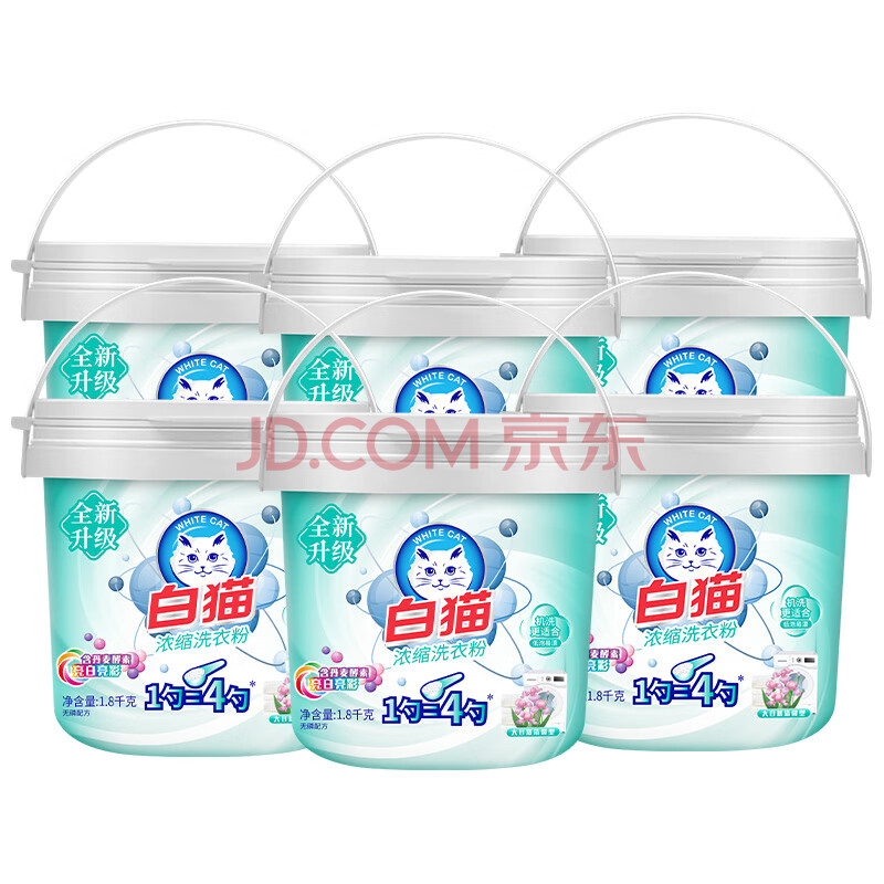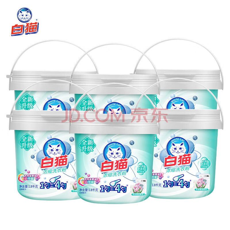 商品相册:白猫 新浓缩洗衣粉3.6斤*6桶 (整箱装) 双效酵素低温速溶 机洗桶装第