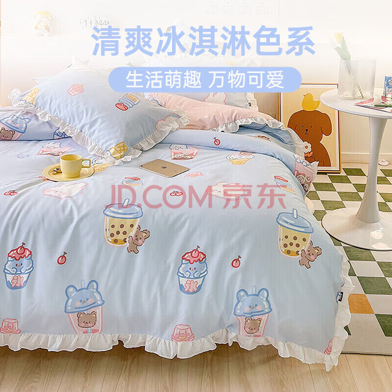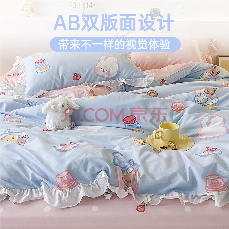 商品相册:多喜爱家纺纯棉床上四件套 全棉被套被罩床单床上用品套件1.5米床203*229cm荷叶边款第