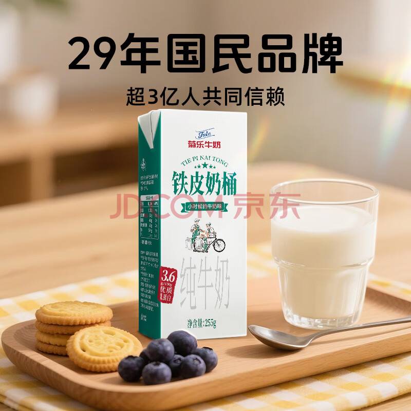 商品相册:菊乐铁皮奶桶纯牛奶255g*12盒3.6g乳蛋白学生早餐奶 送礼盒装第