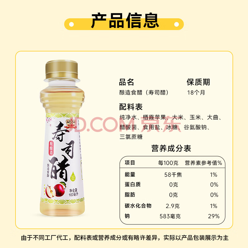 商品相册:吉得利寿司食材 寿司醋100ml 瓶装 0脂日式料理手卷包饭团米醋蘸料第1张/共6