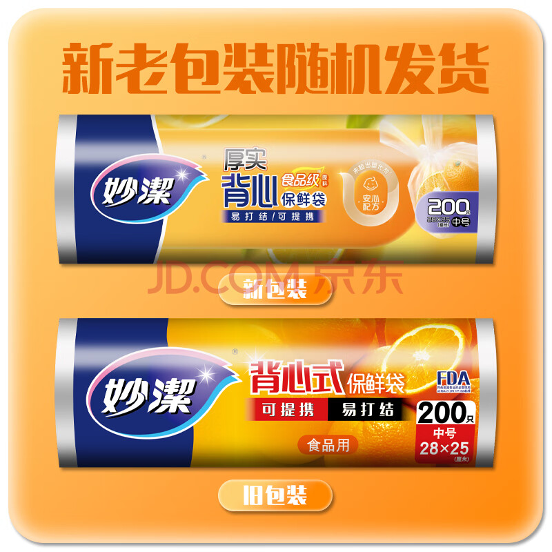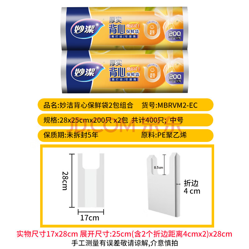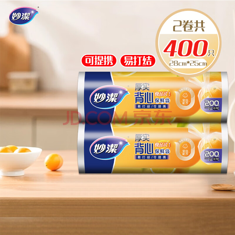 商品相册:妙洁 背心式保鲜袋食品袋 可提携易打结 中号 2卷组合装 400只装第
