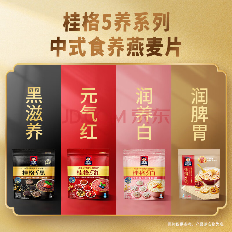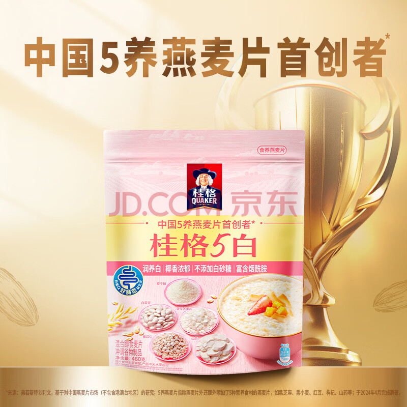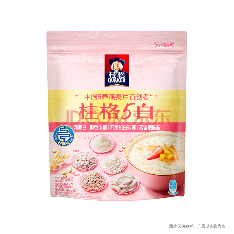 商品相册:桂格(QUAKER)5白混合即食燕麦片460克 添加茯苓 添加薏苡仁 富含烟酰胺第1张/共6